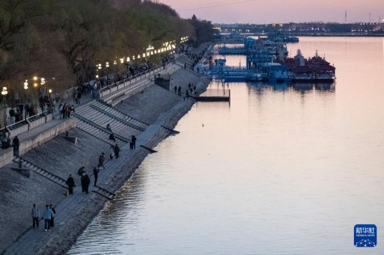 4月22日,人们在松花江哈尔滨段江畔漫步。新华社记者 谢剑飞 摄