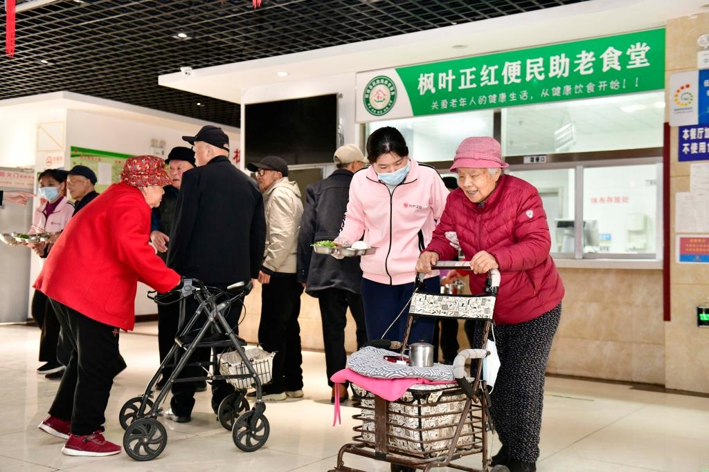 2025年3月12日,在郓城县枫叶正红养老服务中心,工作人员帮助老人取餐。新华社记者 郭绪雷 摄
