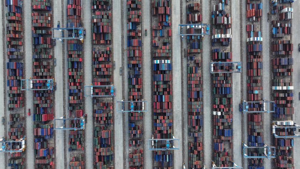 2025年3月4日拍摄的钦州港集装箱自动化码头的集装箱储放地(无人机照片)。新华社记者 张爱林 摄