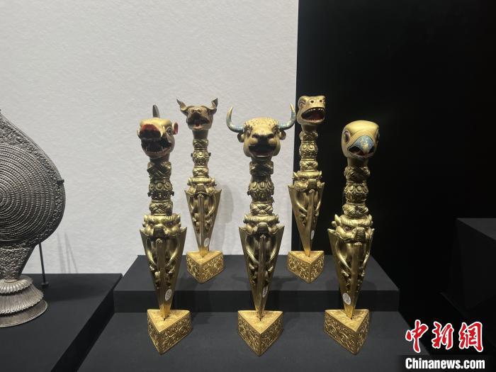 图为展出的铁质鎏金兽首金刚橛。记者 岳依桐 摄