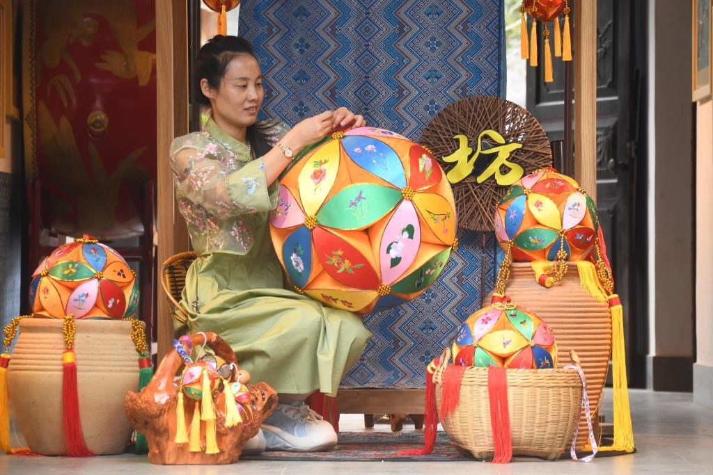 十几年前,山东聊城的王秀芬来旧州村旅游时,被大街小巷挂满的绣球深深吸引。一番思索后,计算机专业出身的她决定“跨界”,留在了依山傍水的旧州村,投身到绣球制作事业中。