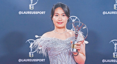 2025年劳伦斯世界体育奖颁奖典礼上,蒋裕燕与奖杯合影。 新华社记者 彭子洋摄