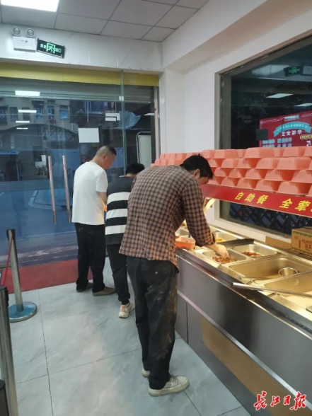 在韩家墩街道简易社区幸福食堂,荣宇恒和工友孙祥盛吃得很香。两人碗里夹了不少菜,有肉有青菜,边聊天边扒饭。