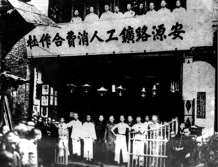 1922年7月,安源路矿工人消费合作社创办,附设在工人补习学校内。图为工人在安源路矿工人消费合作社门前合影。
