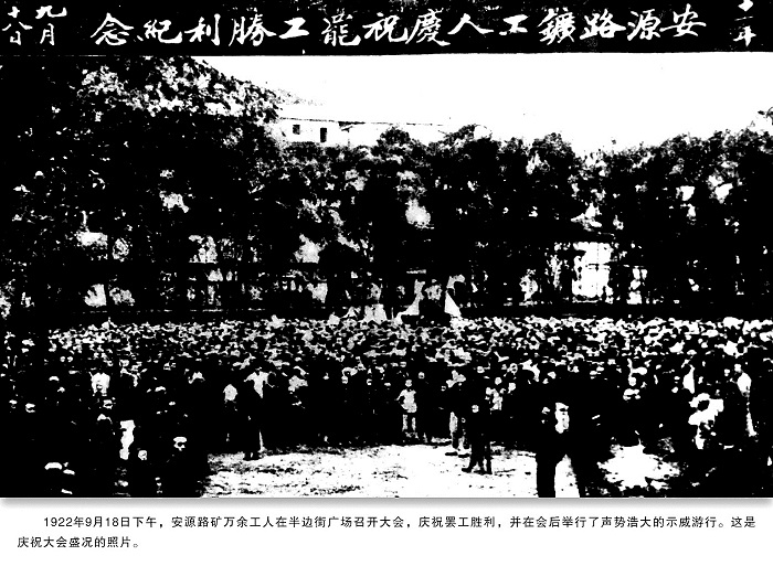 1922年9月18日下午,安源路矿万余名工人在半边街广场召开大会,庆祝罢工胜利,并在会后举行了声势浩大的示威活动。图为庆祝大会盛况。