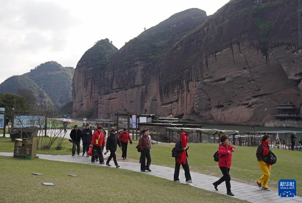 游客在龙虎山仙水岩景区游览(3月6日摄)。新华社记者 万象 摄