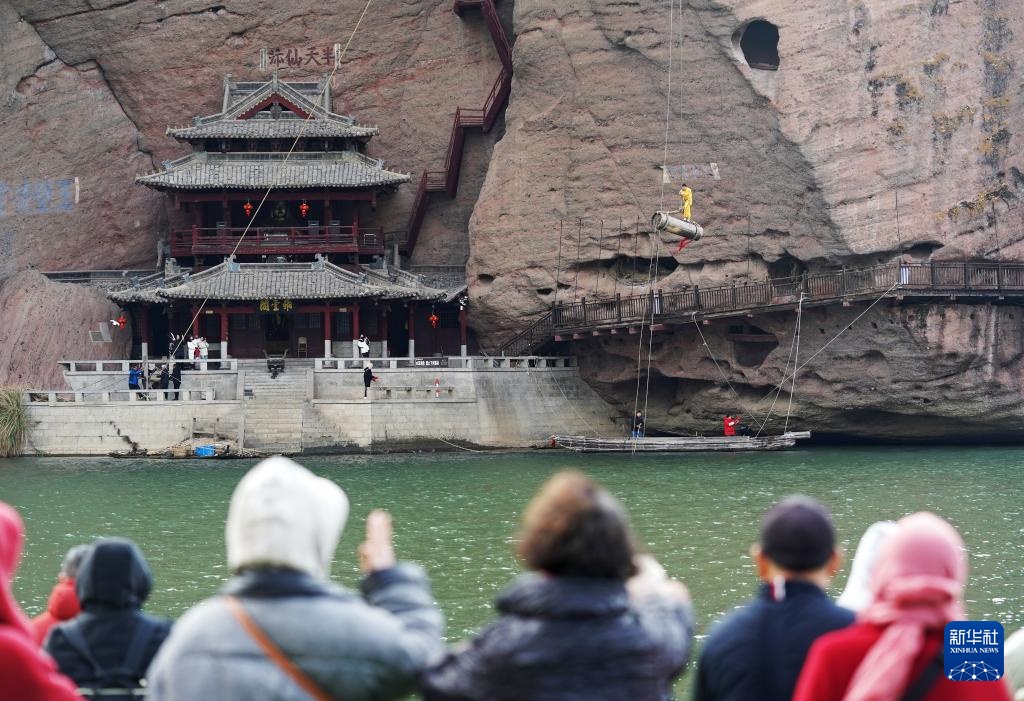 游客在龙虎山景区观看古越悬棺表演(3月6日摄)。新华社记者 万象 摄