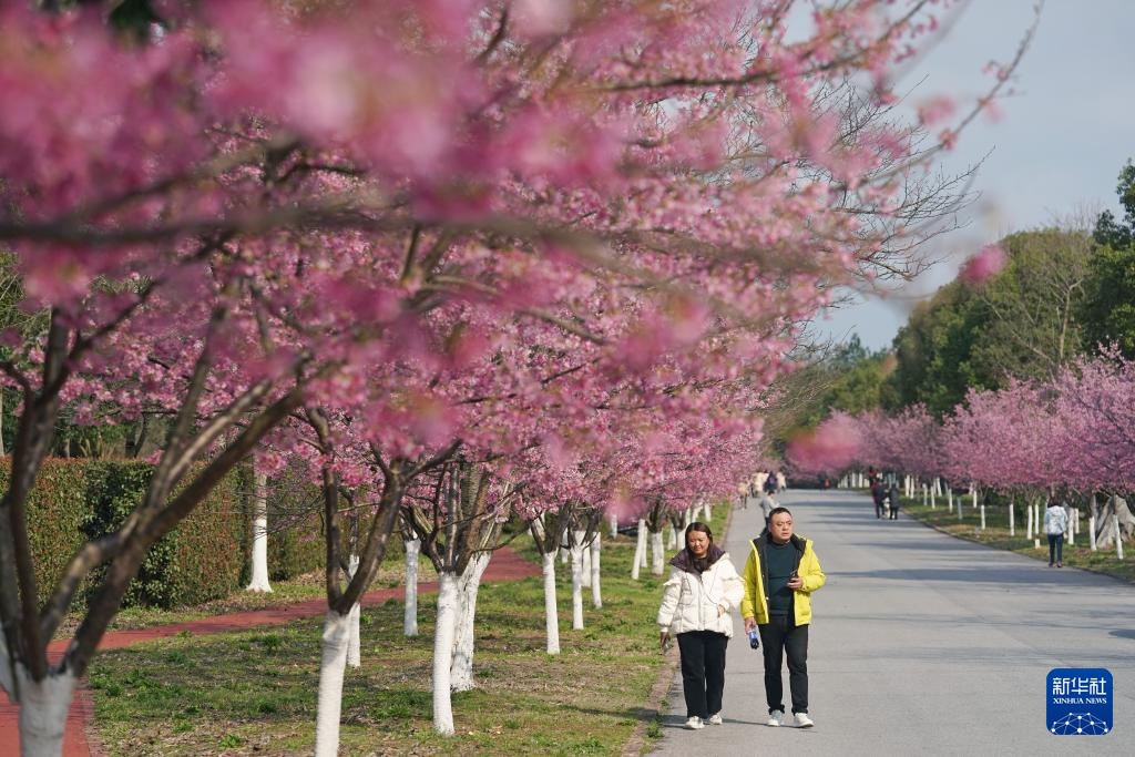 游客在龙虎山景区的樱花大道游览(3月6日摄)。新华社记者 万象 摄
