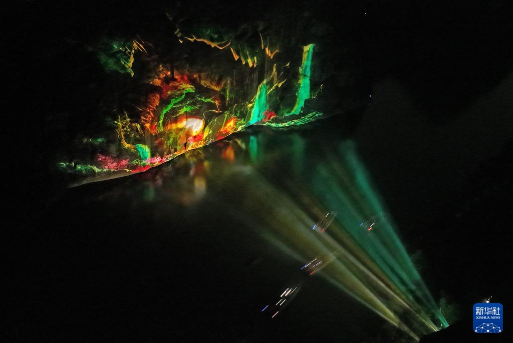 这是山水实景演出《寻梦龙虎山》现场,游客乘船观看天然崖壁上的裸眼3D投影(无人机照片,3月24日摄)。新华社记者 万象 摄