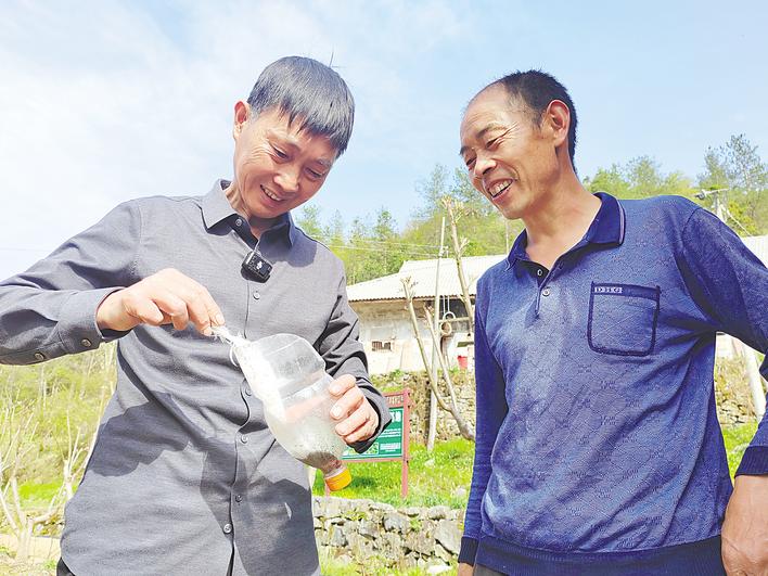 严高红(左)向农户传授养虫经验。湖北日报全媒记者 张泽牧 摄