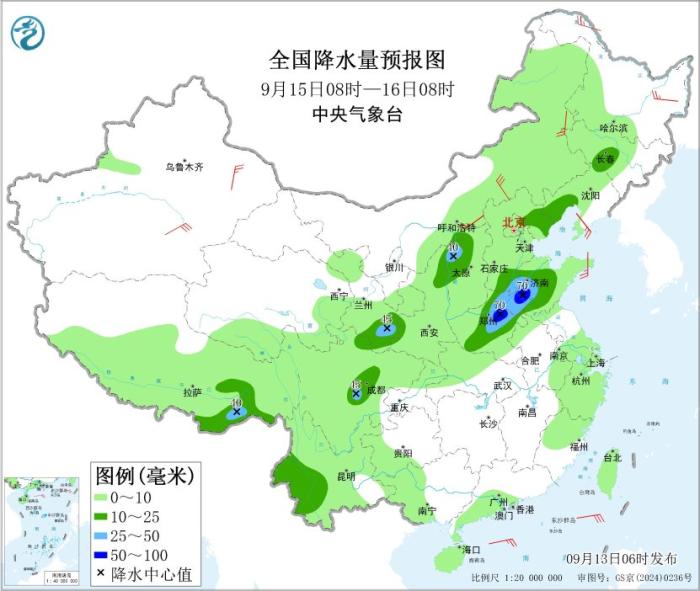 9月15日08时至16日08时,吉林中部、辽宁西南部、河北东北部和南部、山西中北部、陕西北部、河南中北部、山东中西部、甘肃东南部、四川盆地西部、云南西部、西藏东南部等地部分地区有中到大雨,其中,山东西南部、河南中北部等地部分地区有暴雨(50~70毫米)。新疆东部和南疆盆地、内蒙古中东部、黑龙江东部、辽东半岛、山东半岛等地部分地区有4~6级风;渤海、巴士海峡、南海东北部等海域有4~6级风、阵风7~8级。