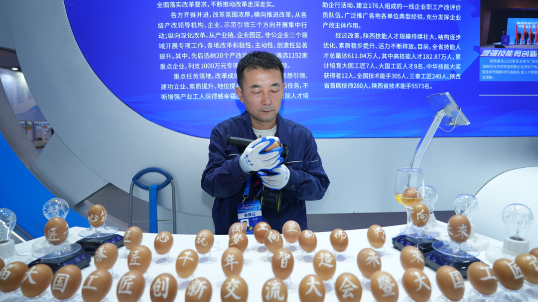 工匠在鸡蛋壳上刻字