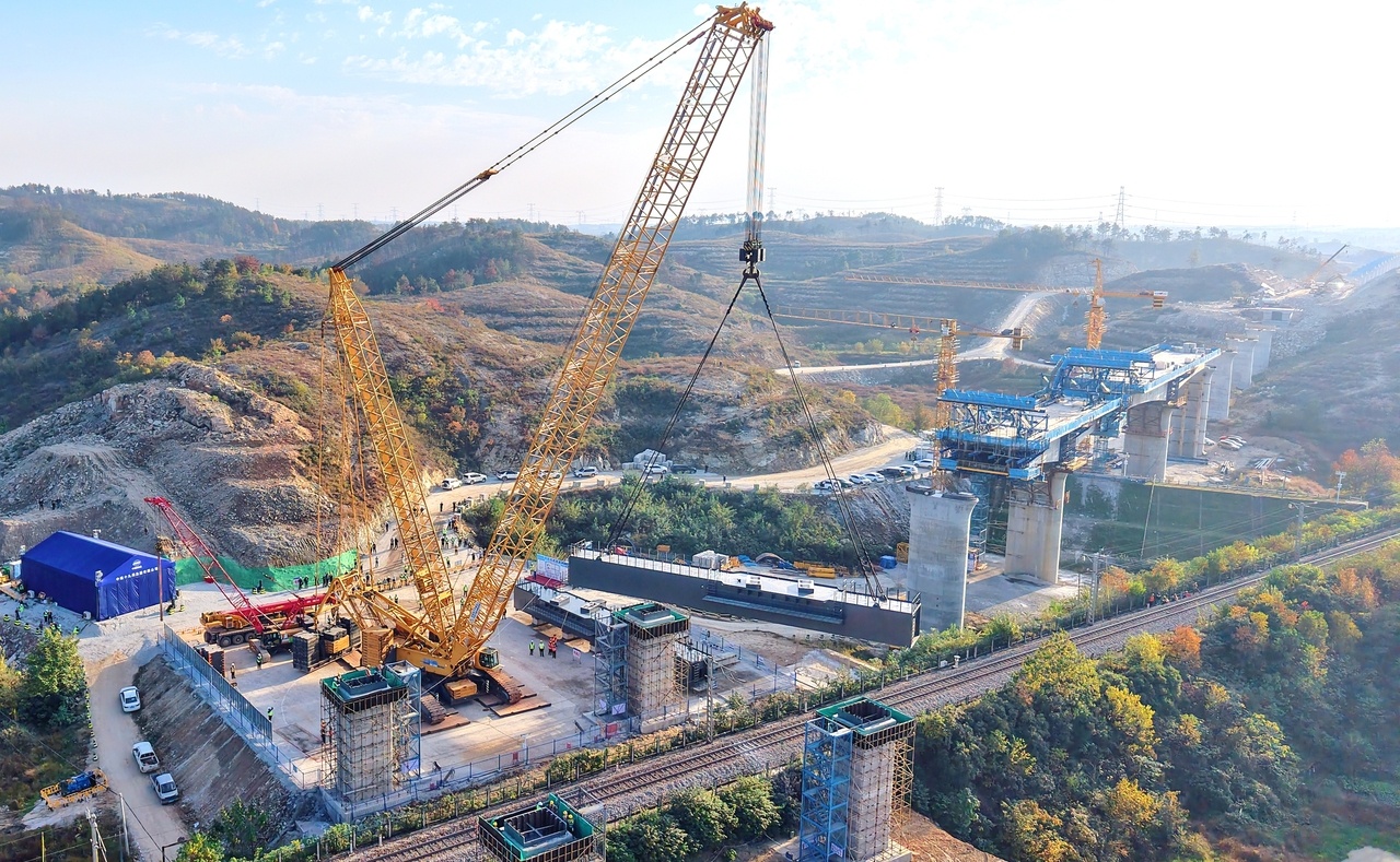 新建合武高铁作为国家“八纵八横”高速铁路网中沿江高铁的重要组成部分,其战略地位举足轻重。该高铁湖北段线路自大别山隧道向西穿越大别山脉,沿既有合武铁路南侧延伸,途经既有麻城北、红安站并实现并站,最终顺利进入武汉市。周家田村跨麻武线特大桥地处湖北红安境内,是合武高铁湖北段的重点控制性工程之一。这座特大桥全长1195.375米,共设32孔,此次完成吊装的2榀钢盖梁是大桥建设的关键构件。