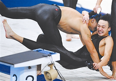 ①北京队在男子4×100米自由泳接力决赛中夺冠,赛后张琳被兴奋的队友“扑倒”。新华社记者 刘大伟 摄