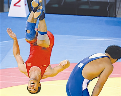 ③夺得男子古典式摔跤96公斤级金牌的山东队选手姜华琛(左)在获胜后翻筋斗庆祝。 新华社记者 杨磊 摄