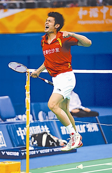 ②林丹在夺得羽毛球男单冠军后跳起欢呼庆祝。 新华社记者 李紫恒 摄