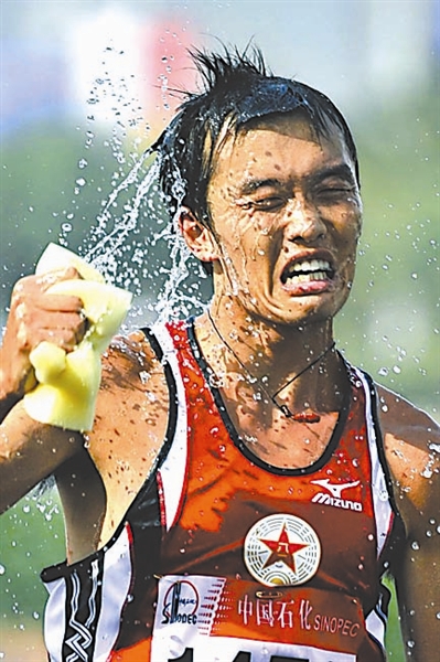 ②10月22日,在济南奥体中心举行的男子20公里竞走的比赛中,来自内蒙古队的王浩赢得冠军。图为比赛中他用海绵为自己降温。 本报记者 许之丰 摄