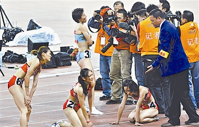 ③10月22日晚,十一运会田径女子400米比赛结束后,冠军黄潇潇大气不喘地接受记者采访,而在比赛中被她甩在身后的选手却长时间坐地不起。看来实力的差距不只体现在比赛中。 本报记者 许之丰 摄
