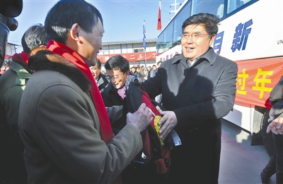 1月23日,中华全国总工会副主席、书记处第一书记王玉普等领导同志来到北京地铁十号线二期慈寿寺站项目部工地,为返乡过年的农民工送行,与农民工握手并赠送慰问金和大礼包。 本报记者 许之丰 摄