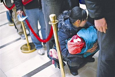 1月17日,北京儿童医院,一位农民工母亲抱着孩子排队等待挂号。