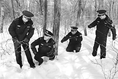 近年来,由于林木资源得到了休养生息,山林里的野生动物有所增多,一些不法分子便把目光瞄在猎取野生动物和盗伐林木上。为了有效保护野生动物和林木资源,八五二分公司成立了12支林政检查小分队,昼夜巡护在林间地带。图为队员查获不法分子狍子套的情形。 邵维信 张丽艳 摄