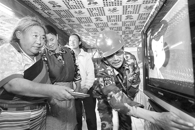 8月26日,在西藏那曲门地乡16村,来自西藏电力有限公司那曲公司的索朗赤来正在帮助尼玛(图左)一家调试电视。随着西藏地区经济的发展,当地居民的用电需求不断增大,为了保证他们正常、安全用电,那曲电力公司的职工经常深入到藏民家里检修线路、普及用电知识,为他们解决用电难题。本报记者 杨登峰 摄