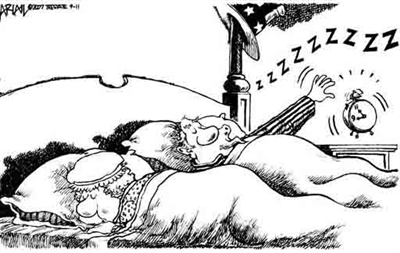 这位画家营造了一种令人窒息的紧张、惊骇气氛,而这一切皆因民众家里那时钟“铃声”触发!因为此时此刻那指针正停留在那个夺命时刻——“9”和“11”,它隐喻的是“9月11日”恐怖袭击的日子!于是这铃声听起来就如10年前世贸双子星座被撞、火焚后“噼里啪啦”的塌垮声……谁听了都睡不安宁、睡不踏实。是啊,除非故障或预置,有谁家里的时钟会在这种时刻铃响?!这便是这幅漫画独具魅力之处,比起不少如实描绘世贸大厦塌垮的其他漫画,构思要高明得多。相信这幅漫画还包含多种意义。当时美国两院授权总统布什动用武力对恐怖主义袭击一事进行报复,先后在阿富汗和伊拉克打响了一场旷日持久的围剿“塔利班”及“基地”组织等恐怖分子的战争。然而这10年反恐“越反越恐”。发生了像车臣非法武装分子闯入莫斯科文化宫绑架观众、巴基斯坦总统穆沙拉夫连遭炸弹袭击、伦敦地铁与巴士相继爆炸、韩国人质遭塔利班武装分子绑架等越来越多的恐怖袭击事件。所以,这幅漫画铃响产生的强烈气场已然像“绝命铃声”,既是国际安全形势的客观反映,也为世界反恐敲响着警钟。