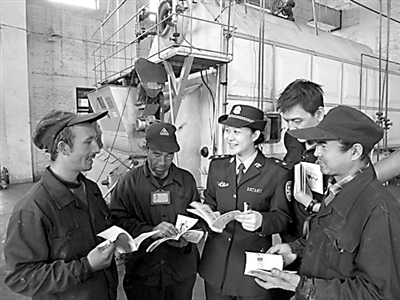 为进一步提高辖区职工群众的法律意识和法制观念,库尔勒铁路公安处成立了“宣传工作队”深入站段、车间开展法制宣传教育活动。图为2月27日,库尔勒车站公安派出所民警到辖区库尔勒天汇分公司库尔勒热力综合服务站,向锅炉房车间在岗职工进行安全常识宣传。孙婉茹 许荔