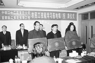 3月23日,中国铁建二十二局集团公司在位于北京房山区的第四公司项目部举行2012年北京市首批农民工技能学习基地揭(授)牌仪式。据悉,北京市自去年以来实施首都职工素质教育工程,以提高广大职工和农民工素质。中铁二十二局集团在2012年北京市首批15家首都职工素质教育工程基地中有4家入选正式授牌,成为在京央企授牌最多企业。