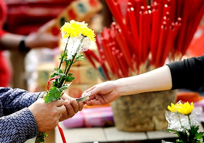 4月2日,江西省南昌市瀛上墓区,一位市民正在购买用于祭奠逝者的黄菊花。 新华社记者 周科 摄