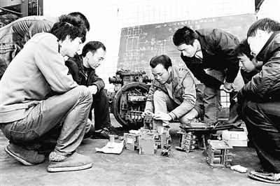 “这个三相真空管的开距很有讲究,调节螺栓松紧不一都有可能烧电机。”11月29日下午,重庆能源集团逢春煤矿机电队电工技师冯静(中)边讲解边模拟操作,把维修QBZ-80型防爆开关中真空管故障的方法和步骤讲得清清楚楚,他管自己这个带徒方法叫做“现场模拟法”,他用这种方法教徒传技,让班里新来的5名电工学徒提前一个月顶岗,让9位高徒今年通过中级工技能考试。 张登泽 王年华 摄
