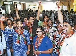 当地时间11月29日,印度帕纳吉,印度人民党青年团的激进分子高呼口号,谴责新闻调查周刊《喧嚣》的总编辑泰帕尔。泰帕尔被指控在11月中旬举办的员工进修活动时两度性侵女记者。东方IC 供图