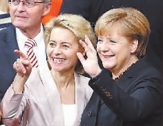 12月17日,在德国柏林国会大厦,默克尔(右)与新任国防部长乌尔苏拉·冯德莱恩出席会议。默克尔当天再次连任新一届联邦政府总理。