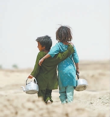 6月12日,阿富汗小姐弟两人手提茶壶在路上行走。新华社发 马苏德 摄