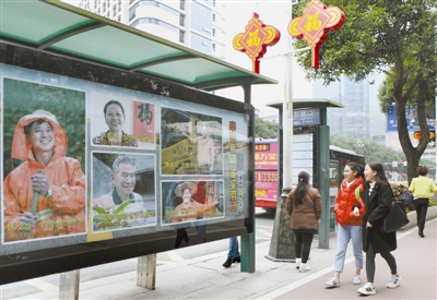 2016年新年第一天,“致敬,劳动模范!”“工人伟大 劳动光荣”“劳动成就光荣与梦想”等主题灯箱覆盖了福州中心城区公交站点,劳模成为城市街头耀眼的明星。