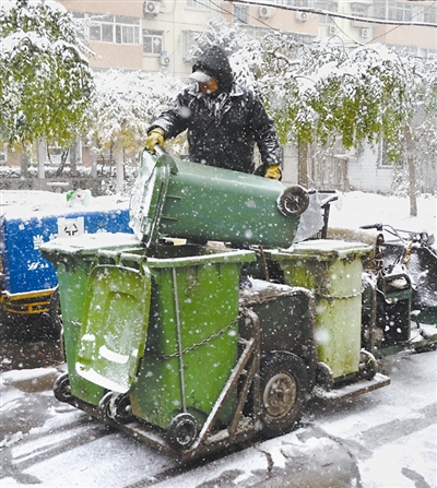 ③在北京之前的一场雪中,环卫工准时清理居民生活垃圾。本报记者 于文国 摄