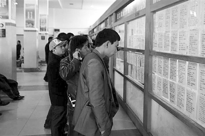 2月14日,杭州人力资源市场内的近20家职介所大部分都已开业,家家窗口上贴着各种招聘信息,许多外地返杭的务工者在查看讨论信息。虽然与去年相比待遇略有提高,但是面对高房租许多务工者表示首先会考虑包吃住的单位。孙伊豆 摄/视觉中国
