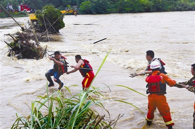 5月5日,消防官兵在广西桂林龙胜各族自治县瓢里镇一河段营救被洪水围困的群众。