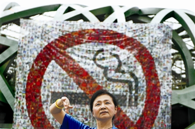 5月31日,北京,世界无烟日当日,悬挂了巨幅禁烟标志的“鸟巢”体育馆。这个标识由上千张笑脸照片汇聚而成。