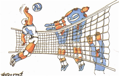 排球比赛的战术变化万千,其目的就是拦阻扣杀和进攻,并给予对手有力的回击。画中的运动员拦网显然是违规了,而作者的思路则是严重违规了。