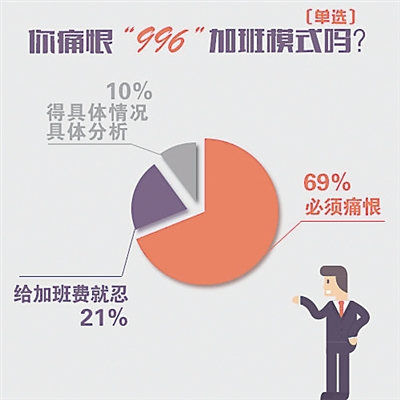 在超过13000名网友参与的调查中,针对“你痛恨‘996’加班模式吗?”这一选项,69%的网友投票表示“必须痛恨”;21%的网友表示“给加班费就能忍”;10%的网友表示“得具体情况具体分析”。