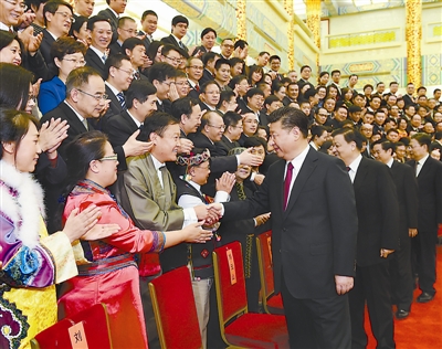 上午9时30分,习近平等来到人民大会堂金色大厅,同代表们亲切握手,并合影留念。