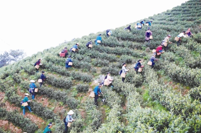 4月9日,在贵州省丹寨县排调镇也居茶园,茶农们在采摘茶叶。