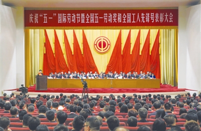 本报北京4月27日电 (记者郑莉 张锐)庆祝“五一”国际劳动节暨全国五一劳动奖和全国工人先锋号表彰大会今天在北京人民大会堂举行。中共中央政治局委员、中华全国总工会主席李建国出席大会并讲话。
