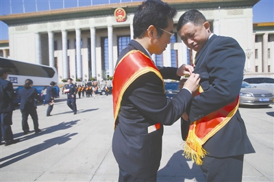 4月27日上午,受表彰代表乘车抵达人民大会堂,他们中的许多人都是第一次来到这里。当日,2017年庆祝“五一”国际劳动节暨全国五一劳动奖和全国工人先锋号表彰大会在北京人民大会堂举行。
