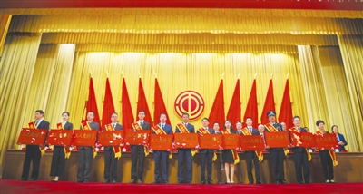 4月27日上午,全国五一劳动奖章获得者代表上台领奖后合影。