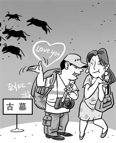 秀恩爱都秀到墓里了?胆子未免太大。时下,总有一些人喜欢刻刻划划,每到一处就“手痒”,总想“千古留名”。情侣之间表达爱意,只要时间、场合、方式合适,一般也不会有人管。但以破坏千年文物为代价来彰显自己的儿女情长,未免太无知无畏了。对文物古迹,要有起码的敬畏之心,如果每个人都在上面“留名”或者“喊话”,一些文物早就体无完肤了。相关部门不是有类似游客“黑名单”之类的制度吗?这样的人就该位列其中,接受教训,也警示他人。