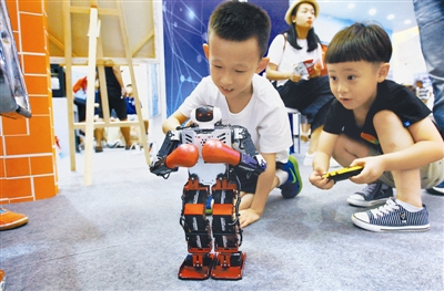 8月25日,两名小朋友在展会上操纵无线遥控机器人。
