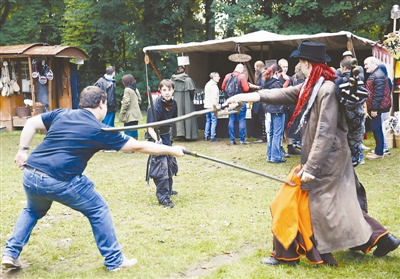 9月16日,在比利时首都布鲁塞尔,中世纪文化爱好者在活动中“比剑”。