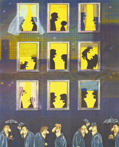如今城市建筑已超出环境所容纳的空间。由此,漫画家想到了沙丁鱼罐头的包装,这个比喻恰如其分地表现出了问题的实质。【古巴】阿瑞斯